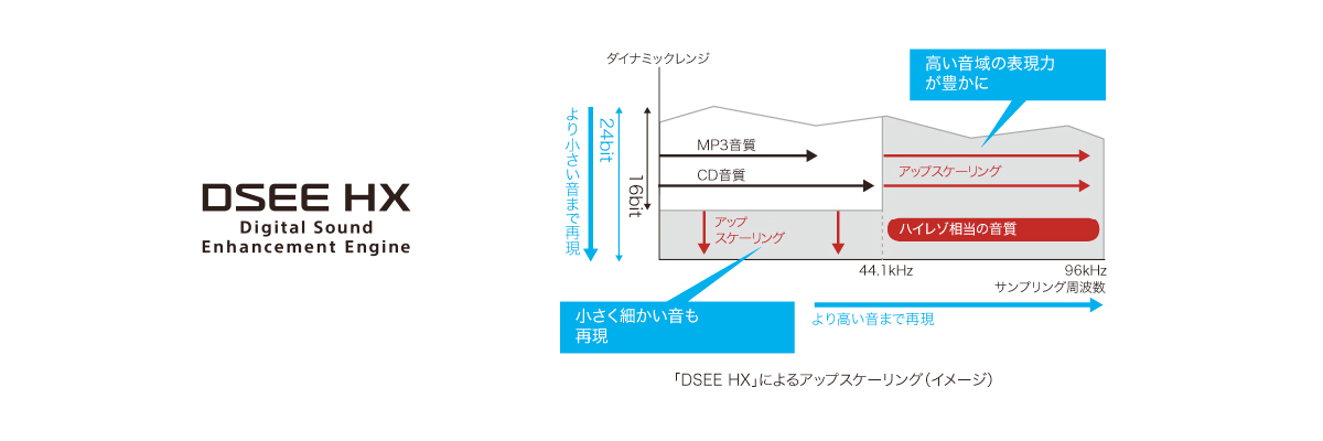 また、圧縮音源であってもアップスケーリング「DSEE HX」機能の搭載によりハイレゾ相当の高音質で再生が可能です。