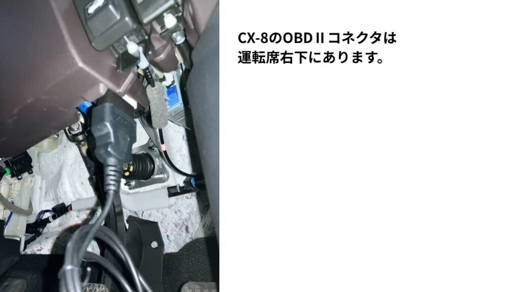 CX-8のバッテリー交換に先立ち、メモリバックアップ電源として、『メルテック製OBDIIタイプ メモリーバックアップ用電源MG-101』をCX-8のOBD2コネクタに接続してPOWERスイッチオン。