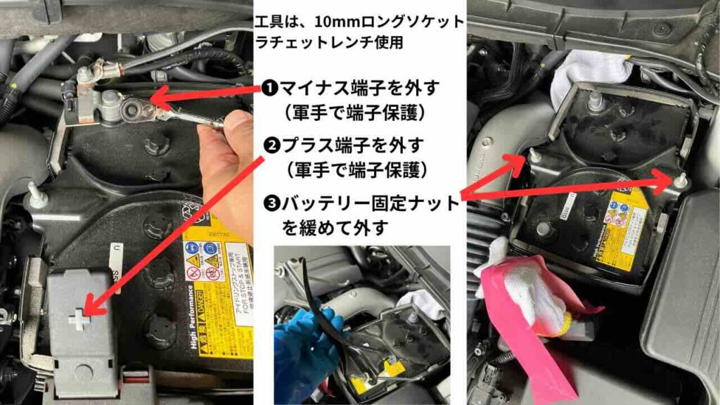 ❶マイナス端子を外す(軍手で端子保護)